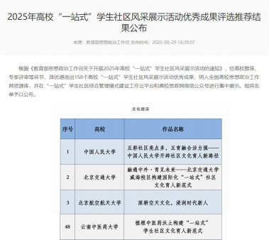 2025 年全国高校“一站式 ”学生社区风采展示活动由教育部思政司主办,经过多轮高校推荐和专家严格评审,共遴选出 158 个高校的 281 项“一站式 ”学生社区风采展示活动优秀成果纳入全国高校思想政治工作网资源库,并在“一站式 ”学生社区综合管理模式建设工作云平台及高校思政网微信公众号进行集中展示,云南省有2个案例入选。