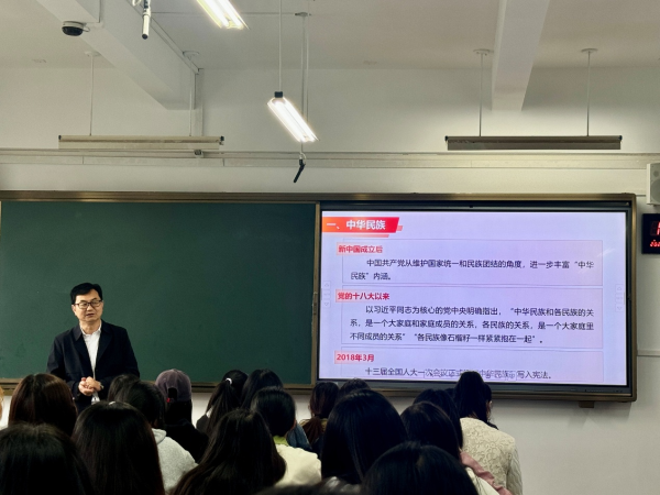 云中讯(统战部)5月28日下午,校党委书记邱勇以“铸牢中华民族共同体意识”为主题,在2408教室为2024级学生讲授了一堂内容丰富、逻辑严谨和形式生动的专题思政课。统战部、马克思主义学院党政负责人参与了现场听课。