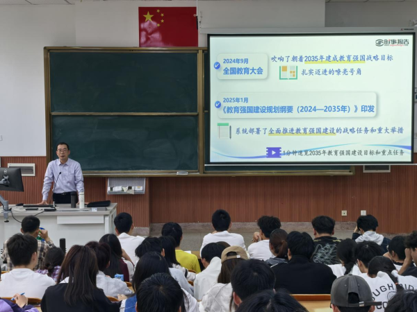 丁中涛以“从教育大国迈向教育强国”为主题,立足新时代教育发展成就,深入阐释了建设教育强国的内涵及重要意义、我国教育的现状、推进教育强国建设的路径,为同学们带来了一堂极具启发性的思想政治理论课。