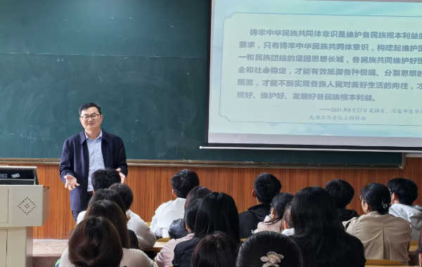 云中讯(统战部)10月11日下午,校党委书记邱勇以“铸牢中华民族共同体意识”为主题,为2024级生物制药班、2024级护理7班的学生讲授了一堂生动鲜活、内涵深刻的专题思政课。