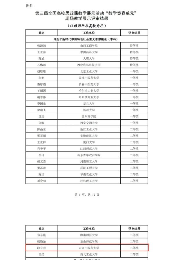全国高校思想政治理论课教学展示暨优秀课程观摩活动,是教育部为深入学习贯彻习近平总书记在学校思想政治理论课教师座谈会上的重要讲话精神,落实中共中央办公厅、国务院办公厅印发的《关于深化新时代学校思想政治理论课改革创新的若干意见》,实施“新时代高校思想政治理论课创优行动”的重要举措。该竞赛每两年举办一次,是全国高校思想政治理论课教学比赛主办规格最高、参赛面最广、参赛选手水平最强的赛事,也是列入《教育部评审评估和竞赛清单》的重要赛事。第三届全国高校思想政治理论课教学展示活动自2023年8月启动,经过省内选拔、网络评审和现场展示等环节,历时5个多月,涉及12门课程。全国近800名教师参赛,比赛涵盖对参赛教师教案写作、PPT制作、说课、学情分析的综合考察。全国决赛内容现场随机抽取、无准备时间、不使用PPT、使用传统板书,充分检验教师的理论功底、教学积累和综合素质。决赛现场展示环节,由学生评委随机抽取题目,参赛教师听题后进行8分钟讲课,并通过“全国高校思政课教师网络集体备课平台”进行了封闭式现场教学展示网络直播,充分检验教师的理论功底、教学积累和综合素质。云南省委教育工委、省教育厅高度重视,坚持严把政治关、能力关,优中选优,从全省思政课教师中遴选推荐23名优秀教师参加全国展示活动,最终12位教师进入现场展示环节。校党委对参赛教师的努力给予充分肯定,并为参赛教师提供各项保障,确保比赛顺利。马克思主义学院先后邀请多名专家对参赛教师进行一对一辅导,组织磨课。参赛教师周密备赛,全力以赴,最终获得佳绩。