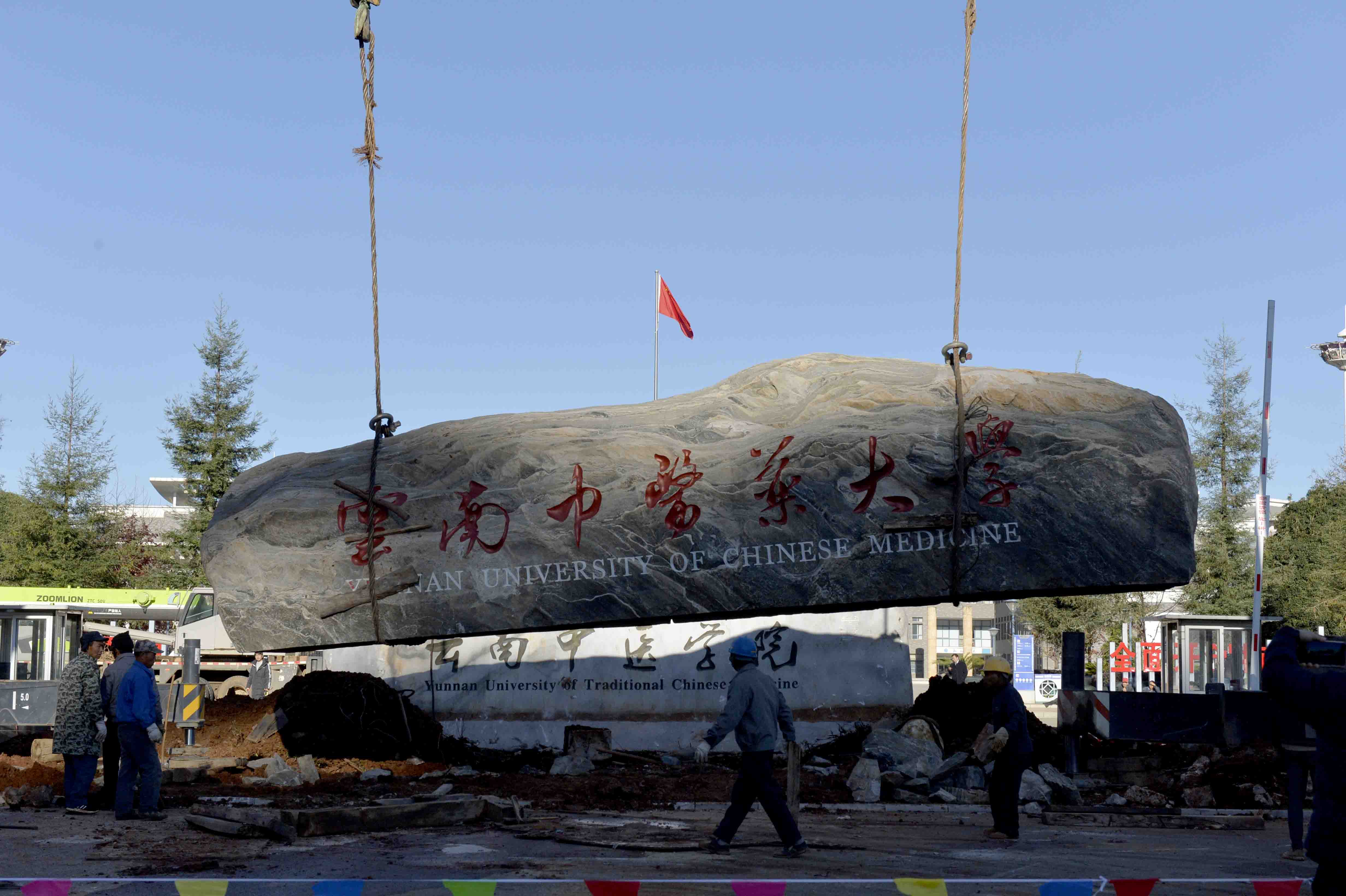 上午8时,由1988届杰出校友、昆明赛诺制药股份有限公司董事长郝振平联合公司捐赠的校名石顺利运抵学校,经过云南石源石文化有限公司3个小时的吊装,成功完成和原校名石的更换。10时56分,校党委书记王翠岗宣布,“云南中医药大学校名石圆满落成”。在现场全体师生校友的热烈掌声与欢呼声中,校领导为校名石培土安石。一时间,校园内欢天喜地,奔走相告。
