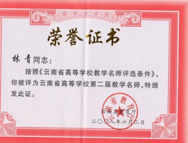林青获评云南省高等学校第二届教学名师