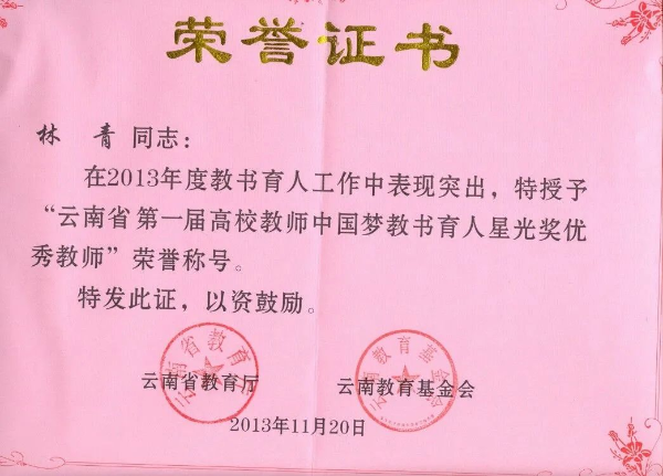 林青获“云南省第一届高校教师中国梦教书育人星光奖优秀教师”荣誉称号