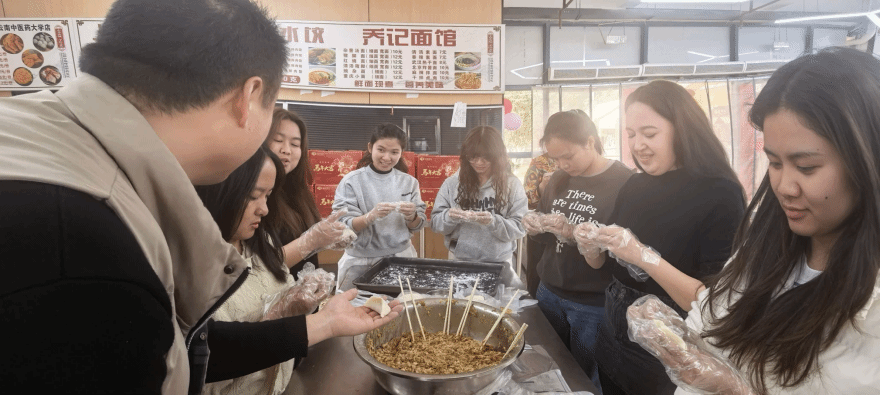 在温馨热烈的气氛中,校领导、老师与同学们一同参与了包饺子活动。大家围坐桌旁,和面、擀皮、调馅、包捏,手法各异,其乐融融,在劳动与欢笑中沉浸式体验中国年俗。现场欢声笑语不断,洋溢着大家庭般的温暖与喜庆。