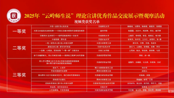 云中讯(新闻与融媒体中心)7月9日,2025年“云岭师生说”理论宣讲优秀作品交流展示暨观摩活动在昆明学院举行。活动当日公布了作品评选结果,我校作品《赓续历史文脉 谱写当代华章》荣获视频类二等奖。