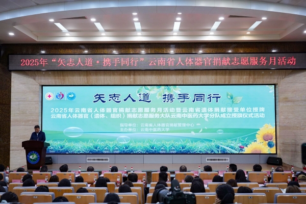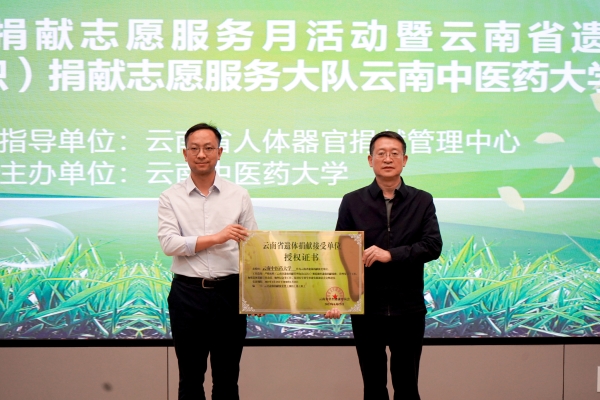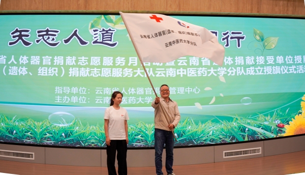 云中讯(基础医学院)5月23日,由云南省人体器官捐献管理中心指导、云南中医药大学主办的“矢志人道·携手同行”2025年人体器官捐献志愿服务月活动在我校举行。云南中医药大学成为云南省遗体捐献接受单位的授牌仪式及云南省人体器官(遗体、组织)捐献志愿服务大队云南中医药大学分队成立授旗仪式同时举行。