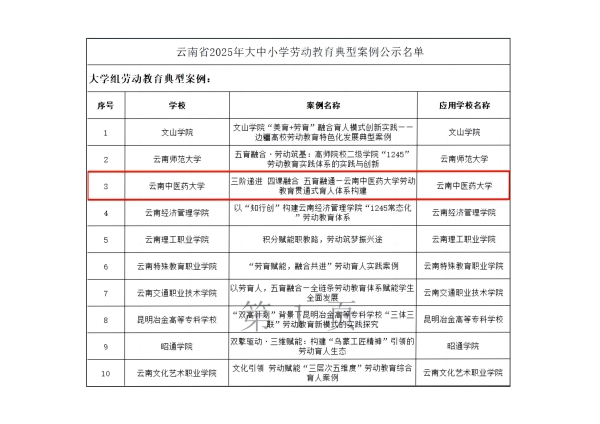 云中讯(学生处)近日,省委教育工委、省教育厅公布了云南省2025年大中小学劳动教育典型案例名单,我校报送的《三阶递进 四课融合 五育融通——云南中医药大学劳动教育贯通式育人体系构建》入选云南省大学组劳动教育典型案例。这是继2023年我校《创新'1+N'打造有中医药味的劳动育人课》入选云南省大学生劳动教育典型案例后的又一劳育成果。