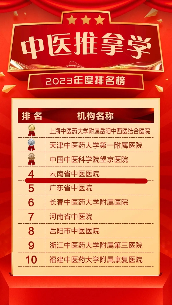 2024年,云南省中医医院推拿科、风湿病科、皮肤科等11个专科入选国家中医优势专科建设单位。其中成立于1962年的推拿科,连续5年被评为中国中医医院最佳临床型专科,在2024年中华中医药学会、中国中医科学院发布的《2023年度中医医院学科(专科)学术影响力评价研究报告》中,推拿科排名全国第四。