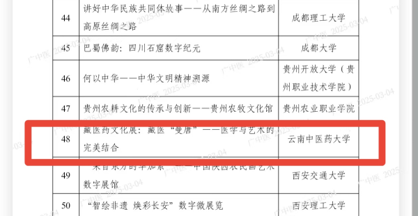 云中讯(通讯员 孔春芹)近日,教育部办公厅公布2024年高校“礼敬中华优秀传统文化”宣传教育活动结果,我校申报的云南省中医药民族医药博物馆“藏医药文化展:藏医‘曼唐’——医学与艺术的完美结合”专题展“数字云展览”入选该活动“创承文脉”高校主题数字微展览联展遴选名单。