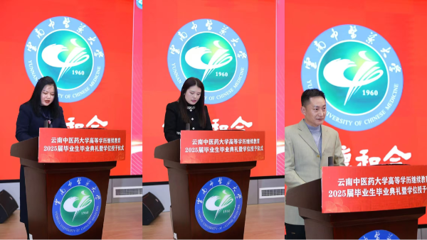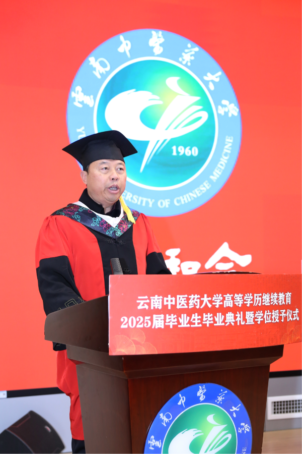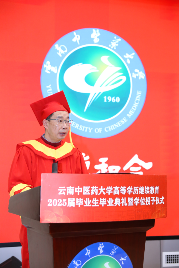 陈祖琨宣读《云南中医药大学关于颁发高等学历继续教育2025届学生毕业证书的决定》《云南中医药大学关于2024年下半年授予成人高等教育本科毕业生学士学位并颁发证书的决定》。