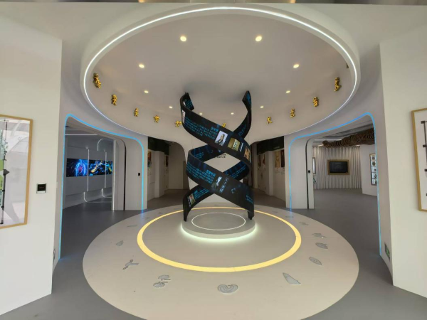 走进人体生命科学馆,迎面映入眼帘的是序厅DNA双螺旋结构造型的LED螺旋屏幕,中西方医学发展史上的代表性人物在螺旋屏幕上循环播放。序厅顶部采用目前世界唯一存活着的象形文字——纳西族东巴文中的部分人体字布展,文字中的人体形态与地面现代解剖学中的人体器官形状呼应。整个序厅既体现了生命之美,又蕴含了中西医结合、中医阴阳五行等理念。