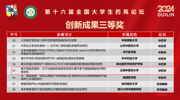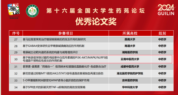 云中讯(教务处 中药学院)11月25日,由药学类院校大学生专业技术与实验技能竞赛组委会主办的全国大学生第十六届“全国大学生药苑论坛”在桂林医学院落下帷幕。我校中药学院瞿璐老师指导的学生团队项目获得优秀论文奖和创新成果二等奖;林玉萍老师指导的学生团队项目获得创新成果三等奖。