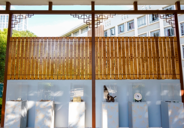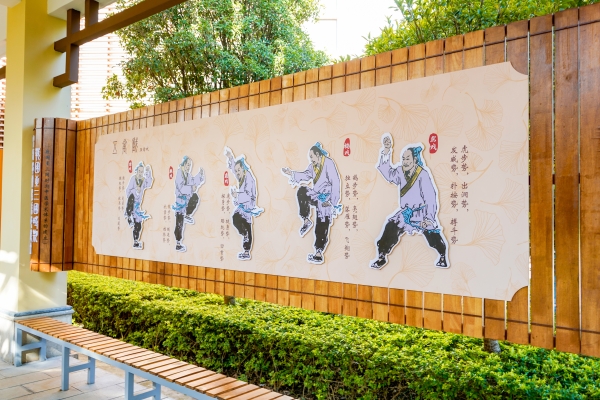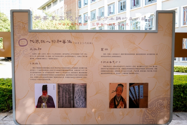 中医药文化长廊全长165米,其设计匠心独运,每一处细节都透露出对中医药文化的尊重与传承,展现中医药文化的博大精深,激发广大师生对中医药事业的热爱与探索精神,力求将长廊打造成为集知识性、科普性、观赏性于一体的中医药文化育人阵地。建设初期,广泛征求专家学者的意见与建议;建设过程中,不断修改完善设计方案,精选优质材料,注重细节处理,力求每一处都能体现出中医药文化的独特韵味。值得一提的是,连廊立柱之间采用框架结构展示板,内容载体依据时代变化而有所不同,如选用了龟壳、卷轴、绵帛等载体,进一步丰富视觉效果。在文字的选用上也别具匠心,随时代的变化,集取了当时具有代表性的书法名家字体,将中华优秀传统文化的精髓与中医药文化巧妙结合,全方位、多角度地展现了中医药的悠久历史、深邃理论和独特魅力。长廊外侧的风雨亭也经过精心设计,展示了中医药学方面的经典著作,使整条长廊的内容更加丰富充实。同时,长廊加装了玻璃顶棚和休闲椅凳,为师生们提供了一个既遮风挡雨又充满文化氛围的学习与休闲空间。
