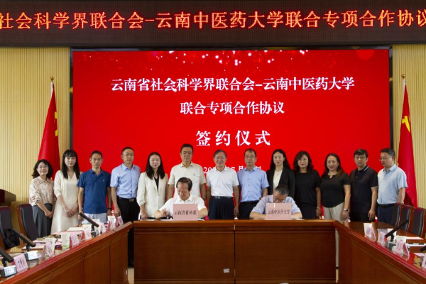 云中讯(科学技术处)7月24日,“云南省社会科学界联合会-云南中医药大学联合专项合作协议”签约仪式在呈贡校区举行。省社科联党组书记、主席海江,云南中医药大学党委副书记、校长丁中涛出席仪式并讲话,省社科联党组成员、副主席王建华与云南中医药大学党委委员、副校长温伟波分别代表双方签订合作协议。