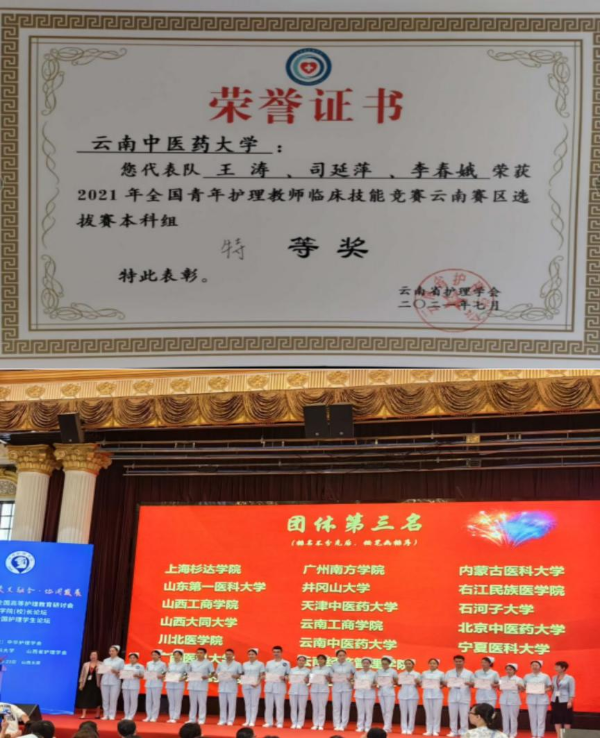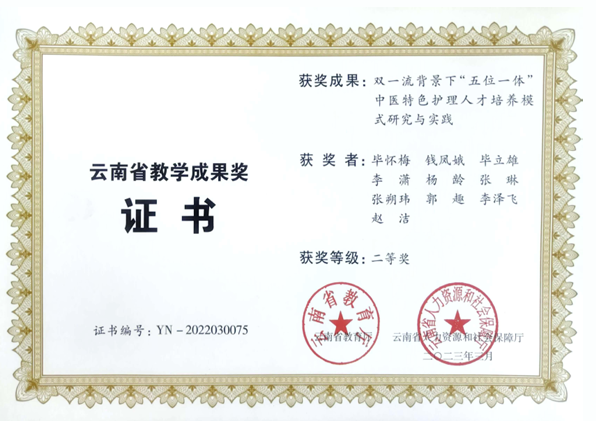 学院充分发挥教师示范引领作用,使教师成为学生立德树人的鲜活榜样和坚定引路人,目前已建成一支党建引领,中西医结合特色鲜明的专业教师队伍。获批教育部高校“双带头人”教师党支部书记工作室,省级虚拟教研室,担任教育部高等学校护理学专业教学指导委员会委员、世界中医药学会联合会护理专业委员会副秘书长、云南省中医药学会中医护理专业委员会主任委员等重要社会职务,获评全国巾帼文明岗、云南省“三育人”示范岗。获云南省万人计划——“青年拔尖人才”称号1人,10人次获全国护理青年教师讲课比赛二等奖、全国护理技能比赛第三名、全国青年护理教师临床技能竞赛云南赛区团体特等奖、云南省科技进步二等奖、云南省高校辅导员素质能力大赛决赛二等奖等奖励,获评全国高等中医药院校优秀党务与思政工作者、全国百名优秀护理标兵、全国高等中医药院校优秀学生工作者、全国高等中医药院校优秀辅导员等荣誉。