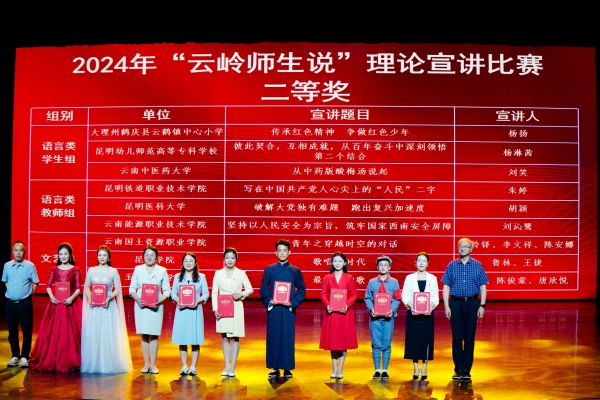 “云岭师生说”理论宣讲比赛由云南省委教育工委、云南省教育厅主办,是云南省教育系统思政教育品牌活动之一,是推进大中小学思想政治教育一体化建设的重要举措。本次比赛以“沿着习近平总书记指引的方向阔步前进 奋力谱写中国式现代化云南篇章”为主题,比赛作品分语言类、文艺类两种形式。活动自4月份开展以来,全省各地各校广泛发动师生员工参与,开展了形式多样的比赛,掀起了学理论、讲理论、用理论的热潮,共计报送宣讲作品385个,最终,来自全省各级各类学校的31组选手入围决赛。决赛现场,选手们紧扣主题,通过深刻的理论阐释、生动的语言表达、丰富的形式载体,从不同角度宣讲习近平新时代中国特色社会主义思想,充分展现了云岭师生昂扬向上的精神风貌。经过激烈角逐,比赛决出语言类教师组一等奖2名、二等奖3名、三等奖5名,语言类学生组一等奖2名、二等奖3名、三等奖6名,文艺类一等奖2名、二等奖3名、三等奖5名。