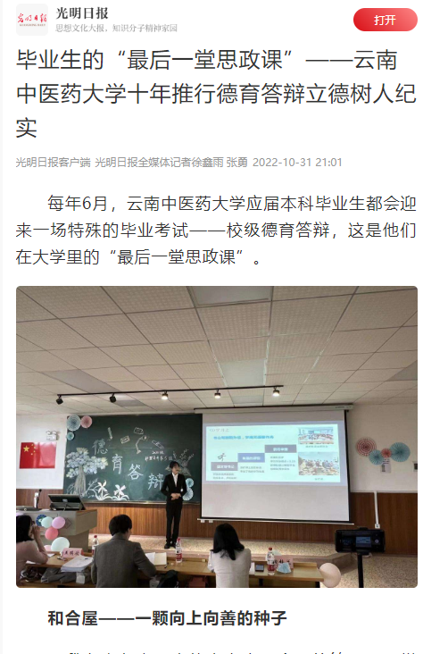 多措并举推进思想政治工作质量全面提升。连续12年在本科毕业生中推行德育论文答辩制度,并作为规范制度纳入学校人才培养方案。强化理想信念教育和价值引领,实行“周四固定学习日”制度,举办张桂梅思政大讲堂云中分课堂、百场形势政策报告会,实施“青马工程”,增强全过程育人动力。统筹联动学校各领域、各岗位教职员工,充分发挥课程、科研、实践、文化、网络、心理、管理、服务、资助、组织等方面工作的育人功能,完善“十大育人体系”功能,丰富网络思政育人资源,“七位一体”深挖全方位育人潜力。发挥学校在实践育人等方面的优势,推动专业课实践教学、社会实践活动、创新创业活动、志愿服务等载体有机融合,形成实践育人统筹推进工作格局,学校中医药服务群众健康、社科普及志愿服务活动蔚然成风。1人入选2021中医药年度科研科普人物,金樱子中医药文化宣传志愿团队志愿者服务项目在2020年第五届中国青年志愿服务项目大赛中获得铜奖。学校近万名教职工和团员青年成为中国和云南省注册志愿服务者,一大批师生主动参与COP15、南博会、旅交会、疫情防控、科普宣传等大型志愿服务工作,展现青春风采和责任担当。发挥中医药在文化育人方面的优势,充分发挥校训、校风、优秀传统文化等在立德树人方面的重要引导作用,依托省中医药民族医药博物馆和中医西学博物馆弘扬优秀传统文化,开展悦读中医、读经典学经典用经典主题系列文化活动,潜移默化引领云中人崇德向善,坚定中医药文化自信。学校文化育人项目《中医文化育人体系构建与实践》入选教育部2020年高校思想政治工作精品项目。
