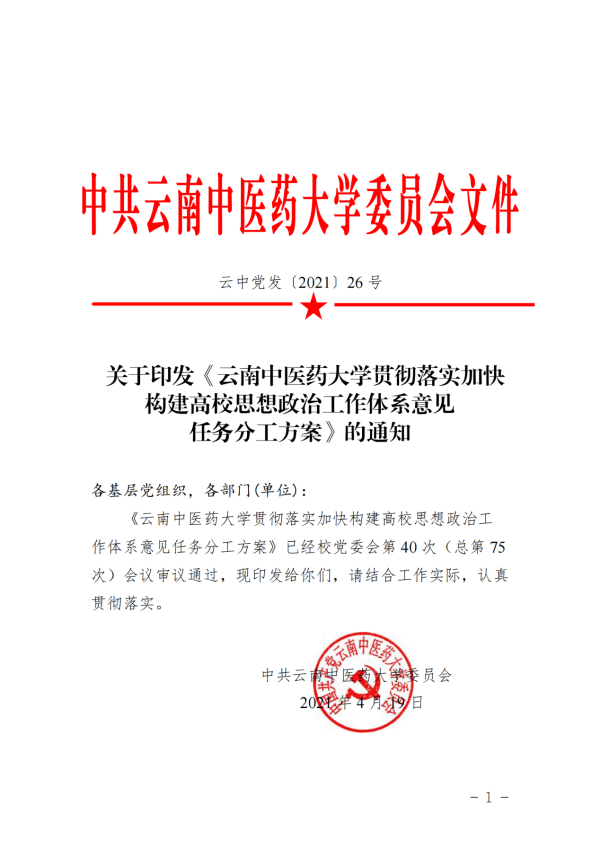印发《云南中医药大学贯彻落实加快构建高校思想政治工作体系意见任务分工方案》