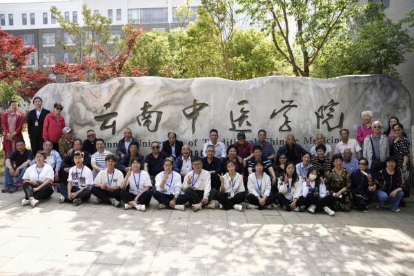 校友们环绕“云南中医学院”纪念石,与学子们合影,深情回忆校园青春岁月及同学间的深情厚意。