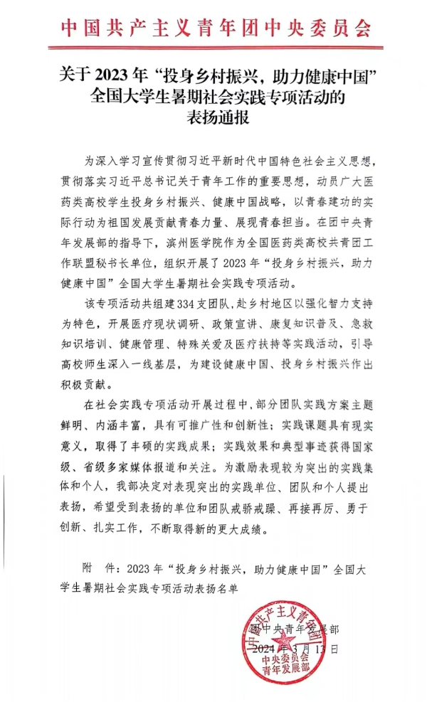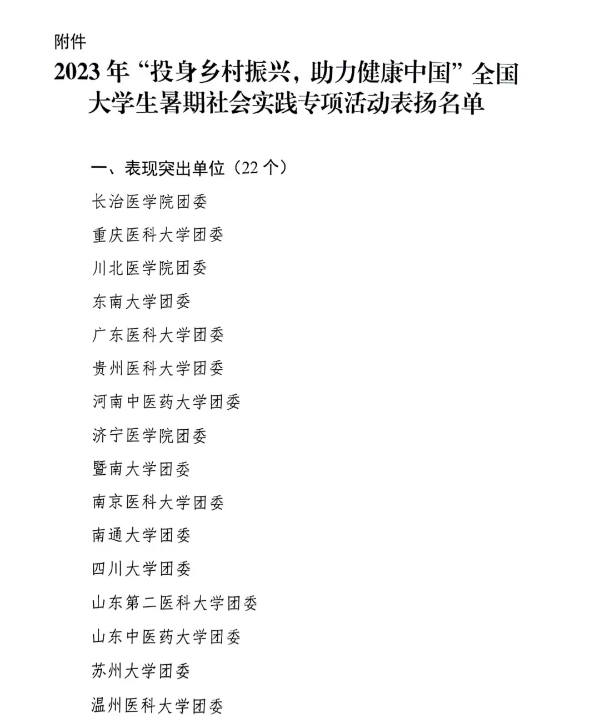 云中讯(校团委)在团省委、学校党委的领导下,校团委组织开展了2023年“投身乡村振兴,助力健康中国”大学生暑期“三下乡”社会实践活动。通过学校申报、审核推荐、组织评议等环节,近日校团委被共青团中央授予2023年“投身乡村振兴,助力健康中国”全国大学生暑期社会实践专项活动“表现突出单位”;研究生会主席团成员马玉珊获“表现突出个人”称号。