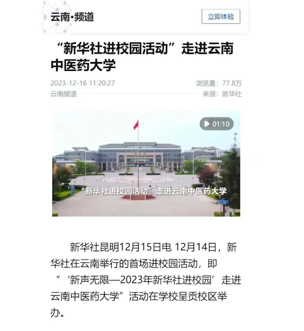 我们把重点工作进展作为外宣报道的重要内容,及时与主流媒体对接,唱响云中高质量发展主旋律。从云南省民族医医院开工建设,到国家中医药传承创新中心项目立项,再到获批2023年省级工程研究中心;从与云南省中医药界学会联合体召开交流座谈,到与云南大学签署合作协议,再到成立省中医推拿科专科联盟;从医药类高校毕业生招聘会举行,到“铸牢中华民族共同体意识”教育实践基地揭牌,再到全国高等院校针灸推拿临床技能大赛创佳绩,云中团结奋斗的脚步从未停歇。