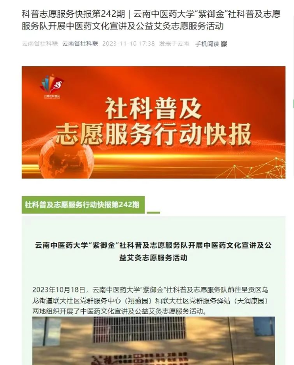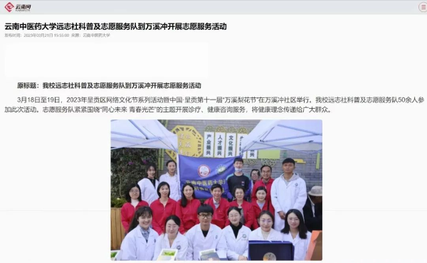 2023年,学校组织多个志愿服务队,广泛开展中医药文化科普宣传教育,开展不同主题的志愿服务活动,让老百姓们“零距离”感受到中医药文化的博大精深,感受到中医适宜技术在养生保健、防病治病中的积极作用。权威主流媒体平台对此进行了广泛的关注报道,传播弘扬中医药文化的同时,展示了云中良好社会形象,汇聚了温暖人心的力量。
