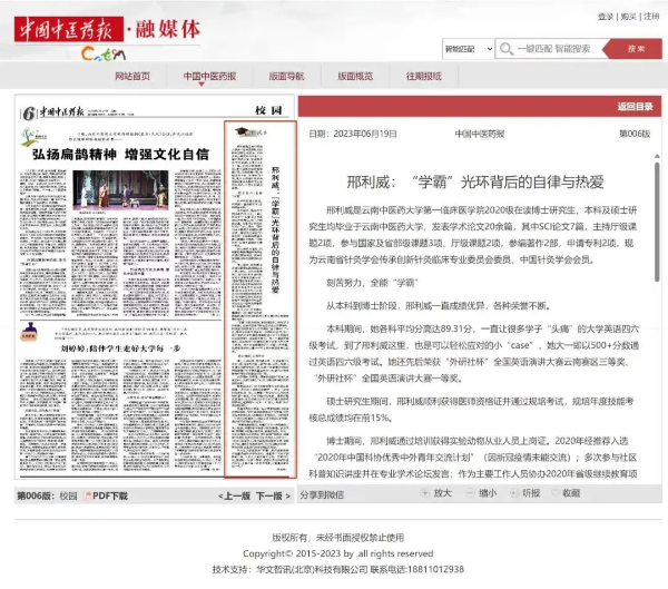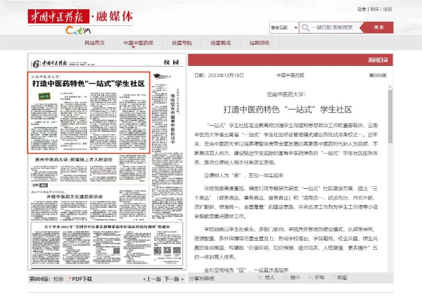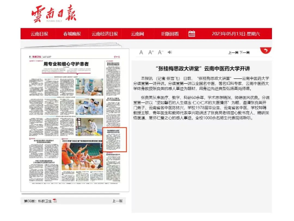“135451”育人模式,张桂梅思政大讲堂云南中医药大学分课堂,德育答辩,“一站式”学生社区,新华社进校园……这些出现在权威主流媒体平台上的关键词,共同弹奏出了立德树人的云中旋律。2023年10月16日,《中国中医药报》3版头条刊发校党委副书记杨鹤清署名文章《云南中医药大学:中医药文化融入立德树人“135451”育人模式构建与实践》。学校开展的两期“张桂梅思政大讲堂”云南中医药大学分课堂活动,多家权威主流媒体平台均进行了报道。4月28日,《云南日报》科教卫生版面头版推出了《春风化雨润桃李——云南中医药大学推行德育答辩纪实》的报道。12月22日,《中国中医药报》6版刊发《云南中医药大学:打造中医药特色“一站式”学生社区》的报道。12月14日,新华社在云南举行的首场“新声无限—2023年新华社进校园”活动走进云南中医药大学,16日,新华社多个平台推出相关报道。