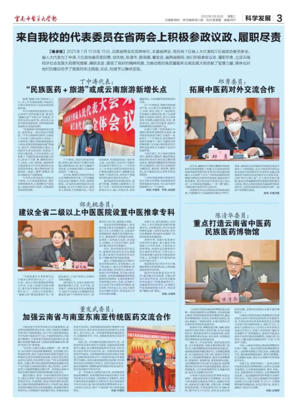 2023年,学校以融入求突破,以贡献求支持,以创新求发展,主动融入云南“3815”战略发展目标谋划,在推动“1221”战略部署落实落地中服务大局彰显担当。2023年7月10日,校党委书记邱勇署名文章《为云南高质量发展作出中医药贡献》在《云南日报》、云南网刊发。2023年1月,我校出席省两会的1位人大代表和5位政协委员积极参政议政、履职尽责,立足云南经济社会发展大局撰写提案、踊跃发言。党委宣传部积极对接权威主流媒体,对各位代表和委员的建议进行了宣传报道,展现了云中人参政议政的良好精神风貌,让云中人为云南高质量发展建言献策的“好声音”更广泛地传播和关注。