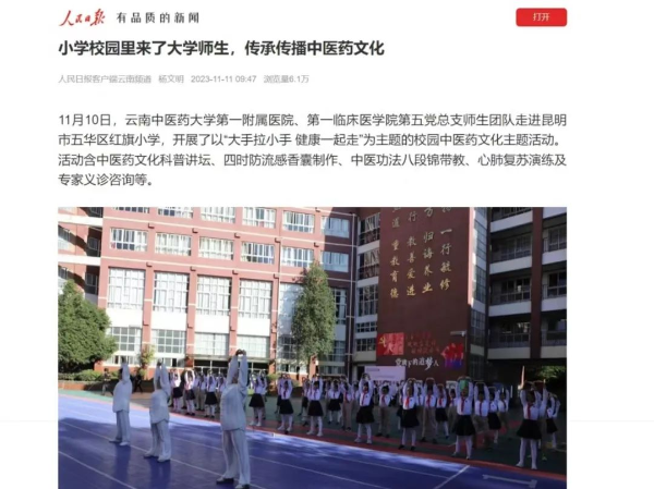 11月11日,《人民日报》客户端报道第一附属医院开展中医药文化进校园活动