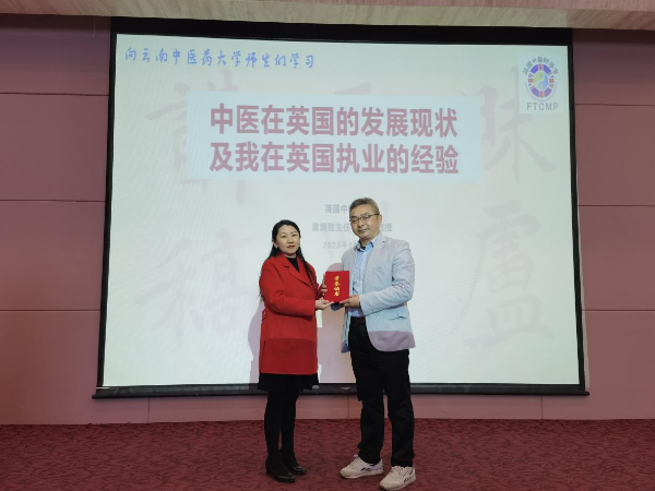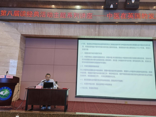 捐赠仪式后,袁炳胜作了题为“中医在英国的发展历史和现状及我的执业体会”的学术报告。他从英国的医疗体系与医疗状况、中医早期进入英国和发展的历史、中医在英国发展的现状三个方面讲述了中医在英国的传播,并结合临床案例分享了自己在英国执业中医针灸全科临床的经验及心得体会。他勉励中青年学生要爱上中医,学好中医。讲座结束后,袁炳胜与师生们进行了深入的交流和讨论。