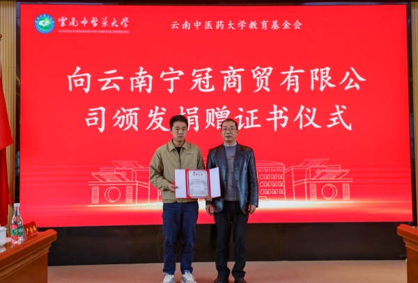 云南宁冠商贸有限公司向基金会捐赠“一站式”学生社区建设项目。丁中涛为公司颁发捐赠证书,与公司代表合影留念。