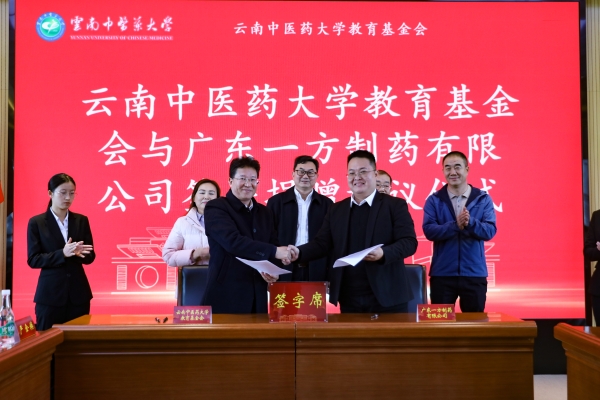 广东一方制药有限公司向基金会捐赠善款用于学校奖助学金。杨鹤清与广东一方制药有限公司代表签署协议。