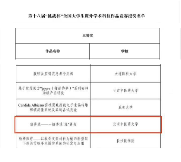 云中讯(校团委)近日,第十八届“挑战杯”全国大学生课外学术科技作品竞赛终审决赛结果揭晓,我校科技发明制作类参赛项目《倍鼻通——一挤香珠“爆”鼻炎》斩获三等奖。