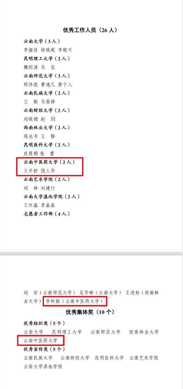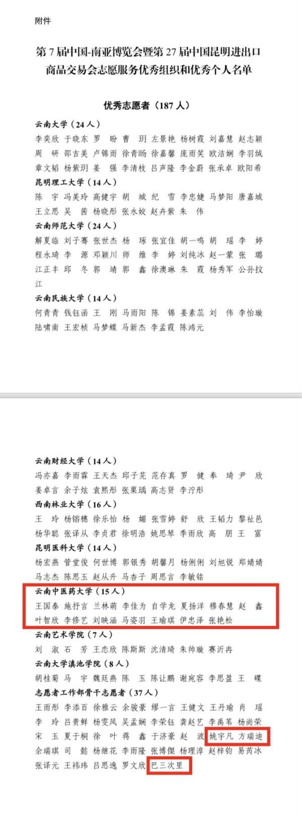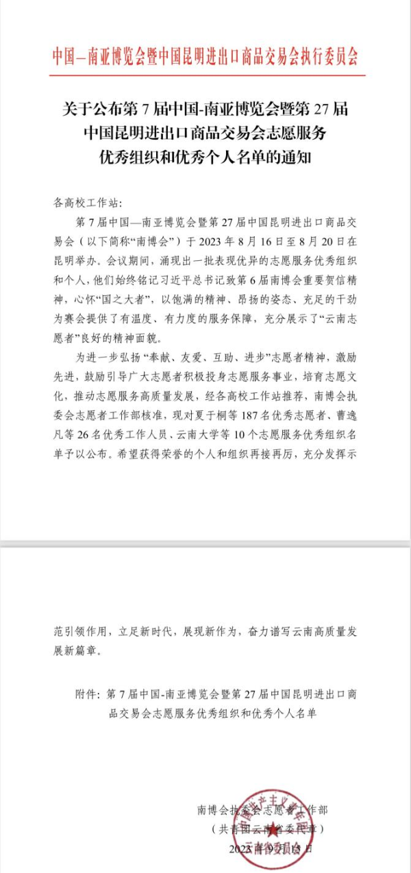 云中讯(通讯员 马应来)近日,南博会执委会志愿者工作部发布《关于公布第7届中国-南亚博览会暨第27届中国昆明进出口商品交易会志愿服务优秀组织和优秀个人名单的通知》,校团委获优秀组织奖,3名老师和18名同学受表彰。