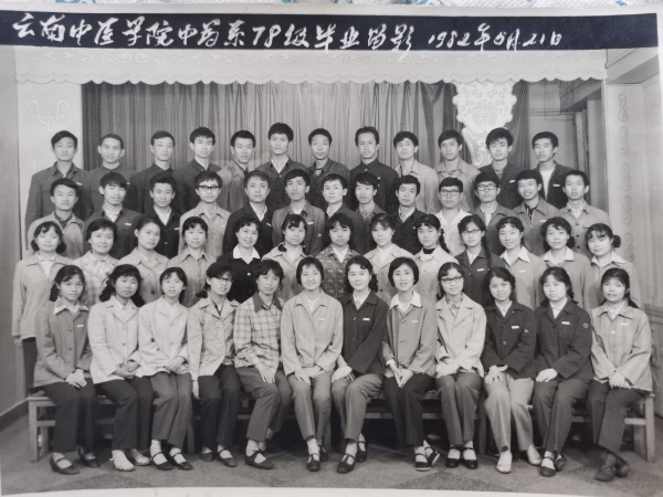 学校中药系78级毕业留影,前排左六为朱兆云,2021年11月当选中国工程院院士