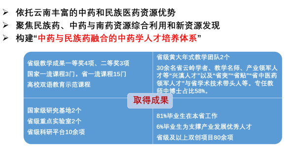 丰富的中药材资源和丰富多样的少数民族医药文化,是云南推进中药少数民族药特色发展得天独厚的优势。学校紧紧围绕云南多民族地区特点,依托云南丰富的中药和少数民族医药资源优势,聚焦少数民族药、中药与南药资源综合利用和新资源发现,构建中药与少数民族药融合的中药学人才培养体系,培养厚基础、强能力、重传承、勇创新的中药与少数民族药融合的中药学人才,服务区域中药产业发展。中药与少数民族药相融合,成为学校中药学人才培养的一大特色。