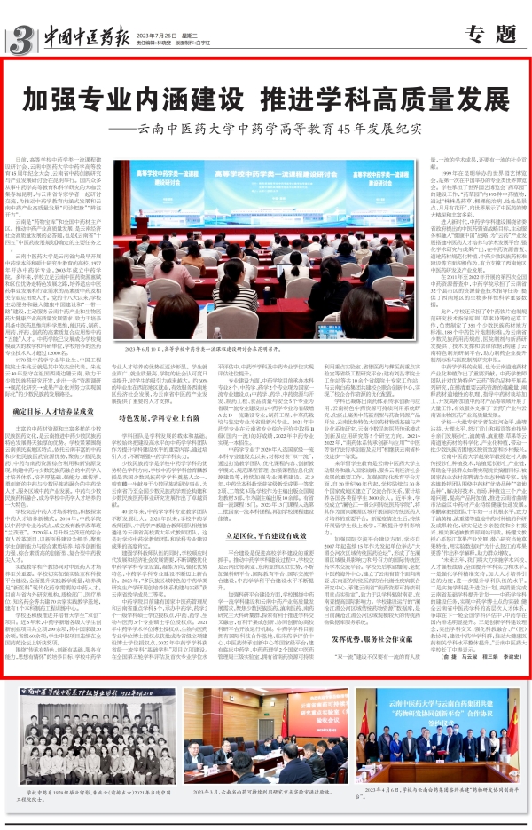 “未来五年,我们将大力实施学术兴校、人才强校战略,全面提升学科实力和水平。一是强化学科精准支持,加大人才培养引进的力度,进一步提升学科队伍的水平。二是实施学科提升进位计划,高质量完成云南省基础学科提升计划——中药学学科的建设任务,实现中药学博士点的突破,健全云南省中医药学科的高层次人才体系,争取在下一轮全国学科评估中,中药学在国内排名明显提升。三是创新学科建设理念,突出学科交叉,强化科教融合、产(医)教协同,建设中药学学科群,推动大健康医药相关学科水平整体提升。”云南中医药大学校长丁中涛表示。(俞捷 马云淑 程三娟 李建宏)