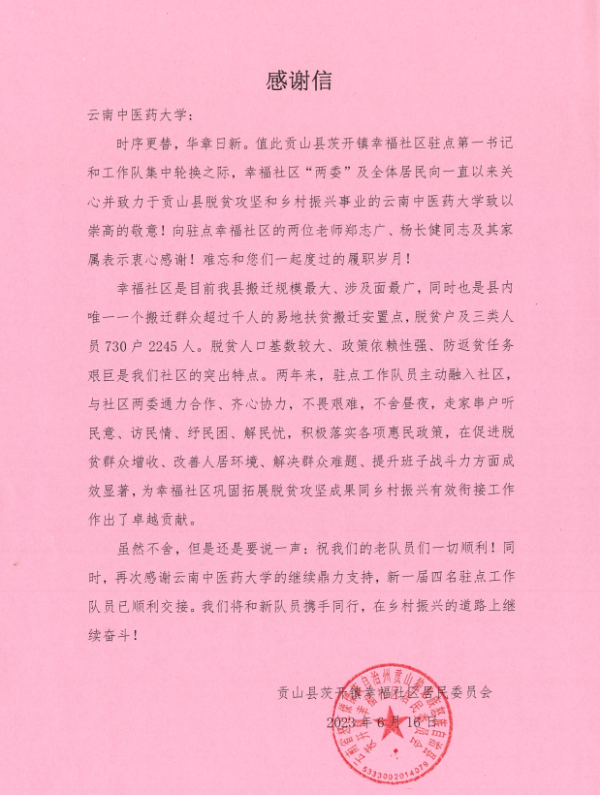 信中提到,云南中医药大学全体驻村工作队员不忘初心、牢记使命,始终将巩固拓展脱贫攻坚成果同乡村振兴有效衔接作为驻村帮扶的第一要务,牢牢守住不发生规模性返贫底线,积极配合党委、政府关于疫情防控工作的一系列重要决策部署,为人民群众生命安全保驾护航;深入村组听民声、察民情、解民忧,用心用情用力帮助群众解决“急难愁盼”问题;扎实建强基层党组织、推进强村富民、提升基层治理水平和绿美乡村建设等工作,为推动全镇乡村振兴开了好局。工作队员主动融入社区,与社区两委通力合作、齐心协力,不畏艰难,不舍昼夜,走家串户听民意、访民情、纾民困、解民忧,积极落实各项惠民政策,在促进脱贫群众增收、改善人居环境、解决群众难题、提升班子战斗力方面成效显著。