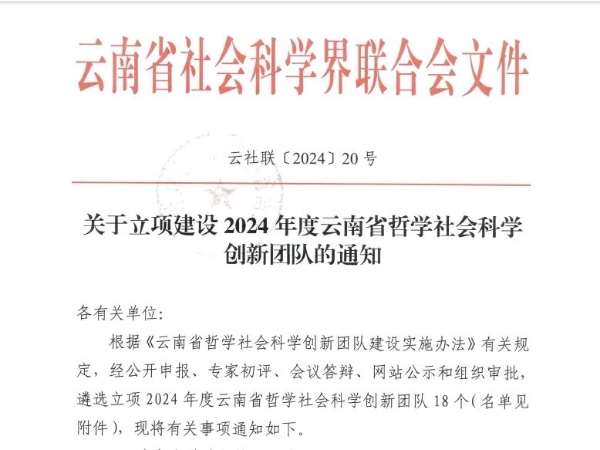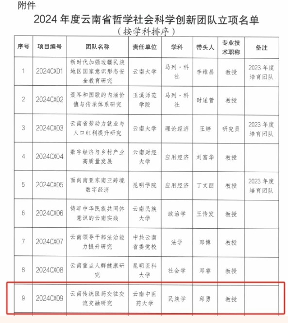 云中讯(科学技术处 新闻与融媒体中心)近日,云南省社科联发布《关于立项建设2024年度云南省哲学社会科学创新团队的通知》,我校邱勇教授带头申报的“云南传统医药交往交流交融研究”团队获云南省哲学社会科学创新团队立项建设。