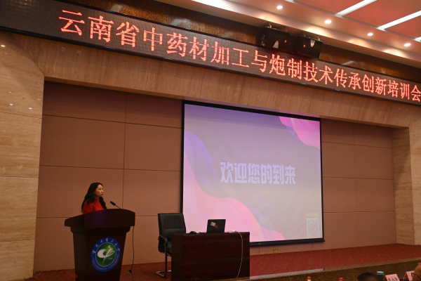 副校长俞捷在培训会议致辞时指出,中医治病的物质基础是炮制后的中药饮片,炮制是中医药的核心技术,国家制定各项政策来推进中药炮制技术的传承、创新与发展。她强调,习近平总书记多次强调中医药是中华民族的瑰宝,要求做好中医药守正创新、传承发展工作。俞捷寄语参会人员,继续推进中药炮制技术传承基地建设,深入研究中药炮制理论和技术,阐释中药炮制机理,探索具有云南特色的炮制方法、炮制技艺,完善中药饮片质量标准,保证饮片质量。