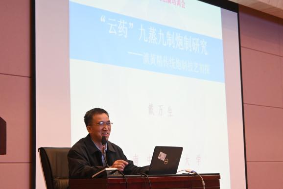 培训会上,云南省中药材种植养殖行业协会会长苏豹就云南省中药材产业发展现状作了详细的情况介绍;云南省中医中药研究院马克坚主任药师就中药材产地加工提高药材品质的创新实践与思考进行深入探讨;云南省食品药品监督检验研究院张雯洁主任药师就中药饮片标准作了专业讲解;云南中医药大学副研究员马晓霞以黄草乌等为例,就云南特色有毒中药材减毒增效炮制研究进行了深入探讨;云南中医药大学戴万生副教授就“云药”九蒸九制炮制研究作了精彩的分享;云南中医药大学邱斌教授就云南道地药材的形成与发展作详细讲解;云南中医药大学赵荣华教授对炮制人的历史使命及中药饮片的发展方向进行了专业讲解。