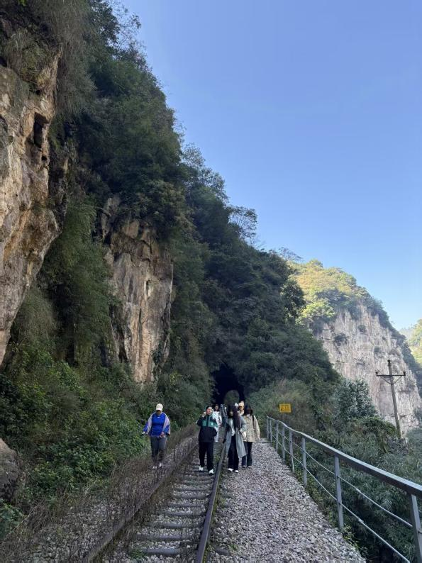 九点四十五分,徒步正式开始。全长7公里的铁轨蜿蜒于山峦之间,同学们依次穿越16座隧道、3座明洞与6座桥梁。斑驳的铁轨、险峻的崖壁、保存完好的桥隧遗迹,无声诉说着那段艰辛而光辉的岁月。隧道中,大家手持电筒,互相照应,在微弱光线下体会当年筑路工人的坚韧;桥梁上,众人驻足远眺,山河壮阔之间,更感受到国家主权与民族尊严的来之不易。