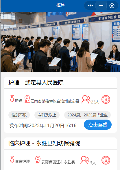 云中讯(通讯员 曾建)在前期沟通的基础上,德宏州中医医院党委副书记钟海萍、副院长张益俊等一行5人11月21日率队到我校护理学院开展专场招聘会。护理学院组织2026届毕业生及部分2025届离校未就业毕业生到场参加,最终15名同学成功通过面试,当场与医院签订用人协议。