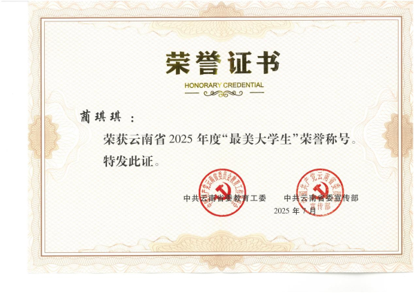 云中讯(学工部)近日,中共云南省委教育工委、省委宣传部公布了《2025年度云南省最美大学生推选结果的通知》,我校第一临床医学院2020级佩衡班蔺琪琪同学荣获“最美大学生”称号。