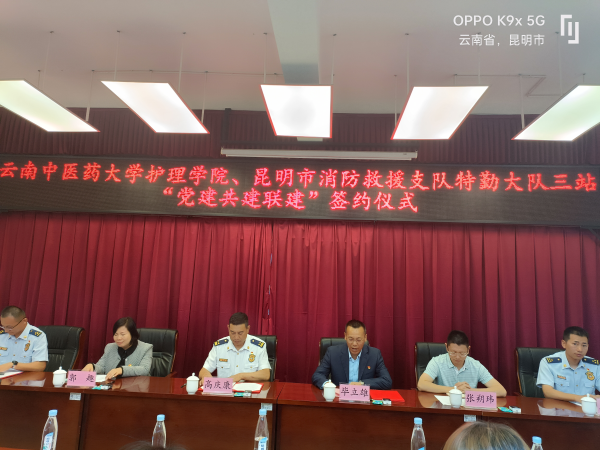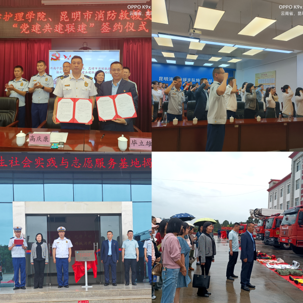 云中讯(通讯员 罗如飞)7月5日下午,护理学院一行到国家山岳救援昆明大队三站,举行“党建共建联建暨大学生社会实践与志愿服务基地”签约及揭牌仪式,护理学院党委书记毕立雄、副院长郭趣、张朔玮,师生党员代表,特勤大队大队长高庆康,特勤大队三站队员80余人共同出席签约仪式。.