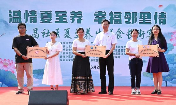 中药学院为文昌社区授云南中医药大学中药学院社会实践基地、中药学院志愿服务队千年健杏林春暖志愿服务实践基地两块牌。