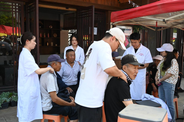 活动现场,中药学院志愿服务队“千年健·杏林春暖”志愿服务团面向社区群众开展中医药知识科普,进行中医义诊推拿理疗服务,志愿者们向群众耐心介绍了中医食疗方法,为群众免费发放中药茶包,引导群众体验中药香囊制作。