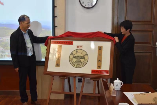 丁中涛曾在云南大学学习和工作,他对母校的培养表示衷心感谢,并对母校百年校庆致以诚挚祝福,代表云南中医药大学向云南大学赠送了由我校师生特意为云大百年校庆精心创作的中药画匾。丁中涛、赵琦华共同为画匾揭幕。