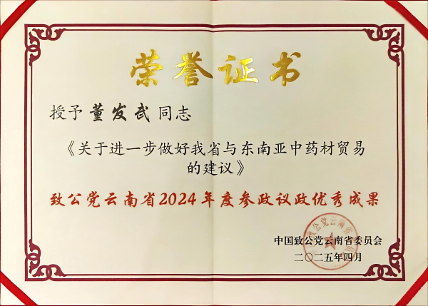 云中讯(统战部)近日,我校致公党支部主委董发武教授《关于进一步做好我省与南亚东南亚中药材贸易的建议》《关于进一步加强边境地区民办学校发展的提案》两项成果,被致公党云南省委员会授予致公党云南省2024年度参政议政优秀成果奖。